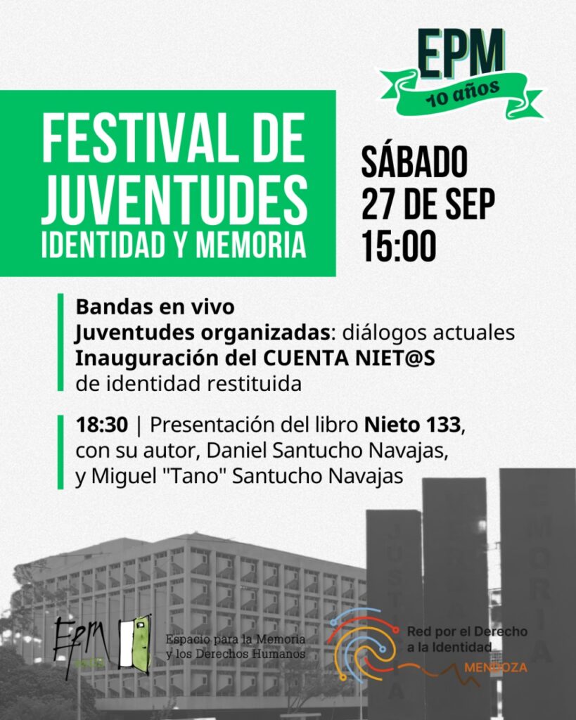 Identidad: Acciones con el Nodo Identidad Mendoza y la presencia de Daniel Santucho Navajas, nieto de identidad restituida 133, y su hermano Miguel “Tano” Santucho Navajas, – Inauguración de «CUENTA NIET@S» de identidad restituida – Presentación del libro «NIETO 133. Mi camino hacia la verdad» de Daniel Santucho Navajas.