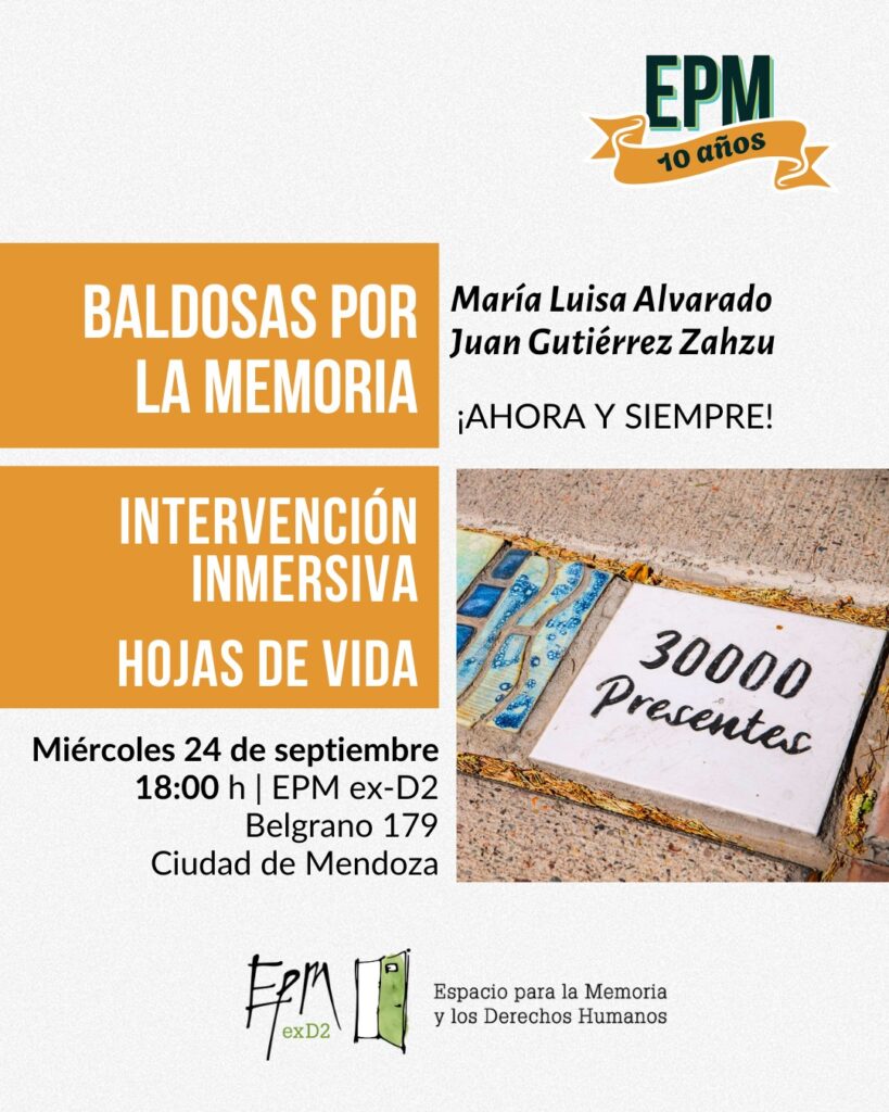 Miércoles 24 de septiembre | 18:00 h –Baldosas por la Memoria: sumamos a nuestro mar de memoria a María Luisa Alvarado y Juan Gutiérrez Zahzu –Intervención inmersiva: por los 10 años de EPM y la presentación del proyecto Hojas de vida de nuestros compañeros y compañeras desaparecidas. Producida por Gino Vachelli, archivos de Mariana Olguín y miembros del EPM.